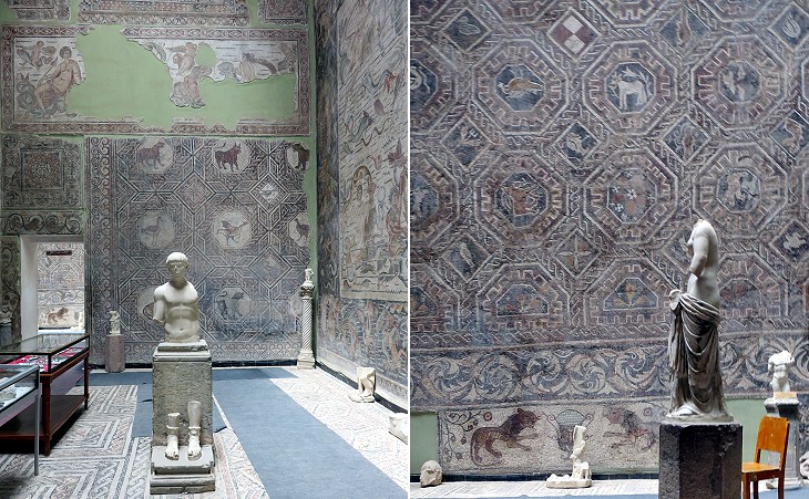 The halls have very high ceilings to allow the vertical placement of the mosaics, which entirely cover their walls. Overall they have a pleasant blueish tint. A small number of statues, including one of Venus, which were mainly found at the Great Baths are also on display.