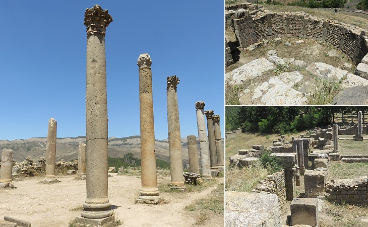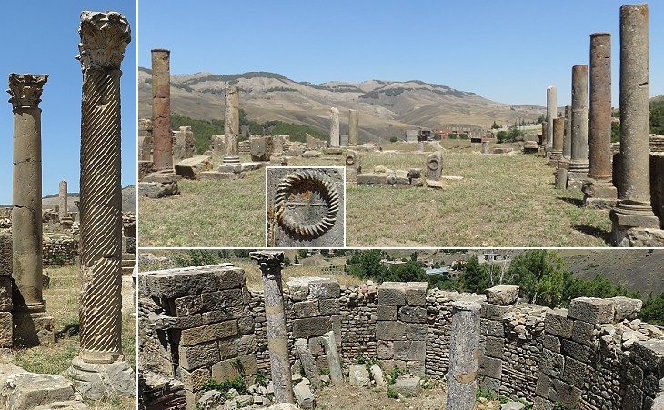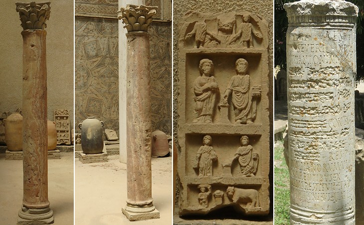 Exhibits outside the Museum of Djemila: (left to right) columns of Simitthus marble, a gravestone and an inscription in which references to Emperor Alexander Severus were erased