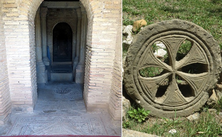 (left) Interior of the Baptistery; (right) stone decorated with a hexagonal cross, a sort of Chi-Rho, a monogram for Christ