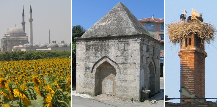(left) Sunflowers at Ikinci Beyazit Kulliye; (centre) a fountain near the Tunca River; (right) a storks' nest in Kaleici (old town)