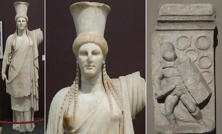 Archaeological Museum of Istanbul: exhibits from Tralles (today's Aydin, a town near Ephesus): (left/centre) archaic caryatid (copy made in the Ist century BC or Ist century AD), you may wish to see the caryatid found at Eleusi; (right) gravestone of a gladiator who won six fights, similar to Skyrtos, a Dacian "retiarius"; another relief portraying a gladiator is shown in the image used as background for this page