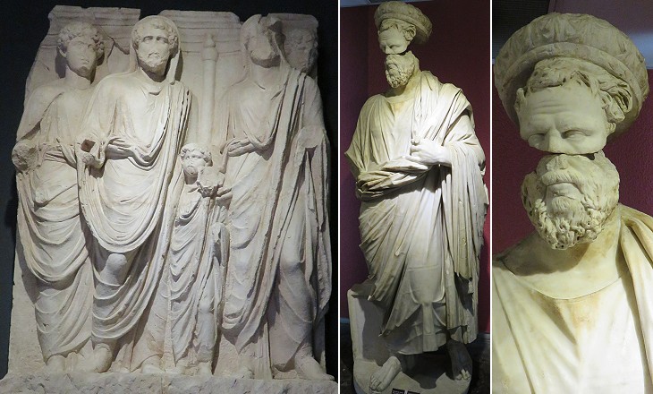 (left) Parthian monument: copy from the Ephesos Museum of Vienna showing: (left to right) Emperors Marcus Aurelius, Antoninus Pius, Lucius Verus and Hadrian; (centre/right) Archaeological Museum of Izmir (Smyrna): statue of the sophist Flavius Damianus, a "flamen", a priest of the Imperial Cult (from Ephesus)