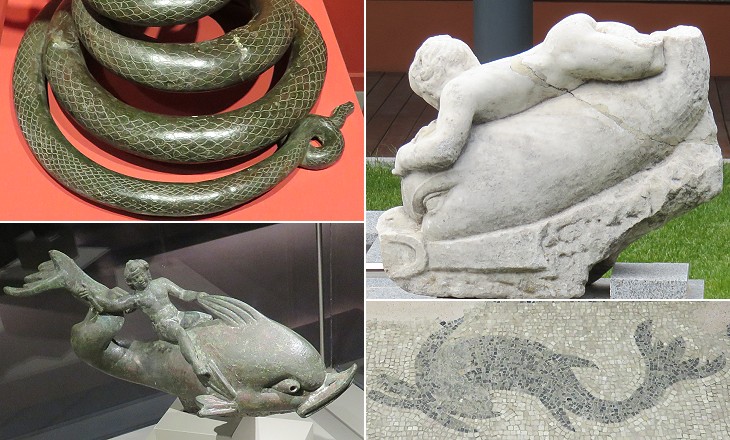 The Archaeological Museum of Ephesus reopened in November 2014 after a very extensive renovation. Its exhibits are the result of findings which occurred after 1929, because before that year statues, reliefs and other works of art ended in the collections of the British Museum in London, the Ephesos Museum in Vienna and the Archaeological Museums of Constantinople and Izmir (not to mention many private collections). The exhibits shown above mainly come from private houses. They indicate the favour enjoyed by dolphins among the ancient Greeks and Romans. The following passage explains why boys were often portrayed riding dolphins.