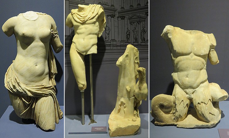 Statues which decorated Trajan's Fountain: (left) a nymph; (centre) Androclus, a hunter and the mythological founder of Ephesus; (right) a triton