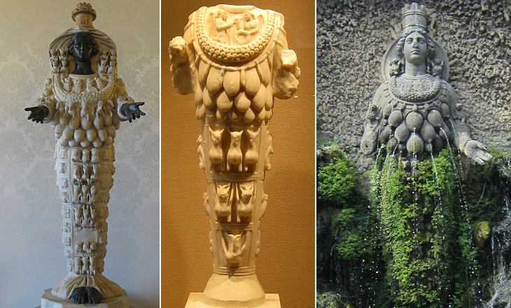 Ephesian Diana in Rome: (left) from the Albani Collection at Musei Capitolini (IInd century AD); (centre) from Villa dei Quintili (IInd century AD); (right) late Renaissance statue in the gardens of Villa d'Este
