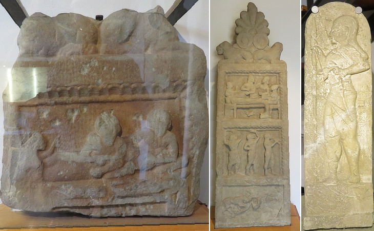 Museo Archeologico di Fiesole: Etruscan funerary objects; (left) cinerary urn (see some finer examples in Florence); (centre) stela (VIth century BC) depicting a funerary banquet with music players; (right) cast of the stela of Larth Ninie, perhaps a military leader (VIth century BC)