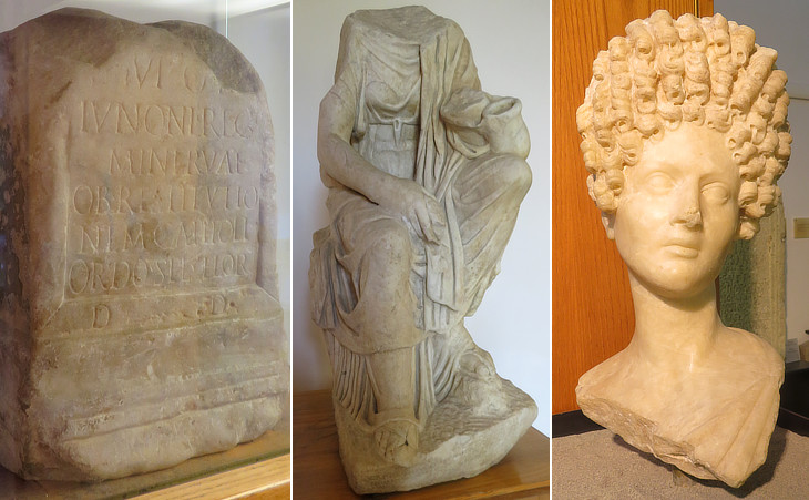Museo Archeologico di Fiesole: (left) inscription celebrating the restoration of a "Capitolium", a temple to Jupiter, Juno and Minerva, the three deities who were worshipped on the Capitoline Hill of Rome; (centre) statue of Isis in the act of mourning Osiris; (right) head of Vibia Matidia, sister-in-law of Emperor Hadrian