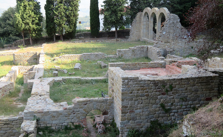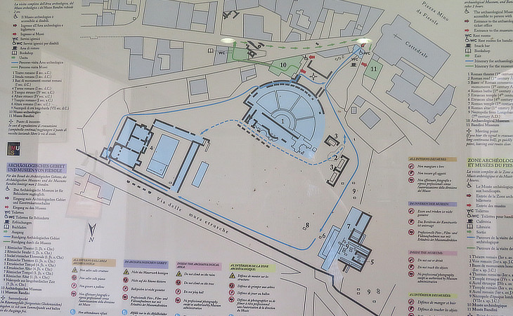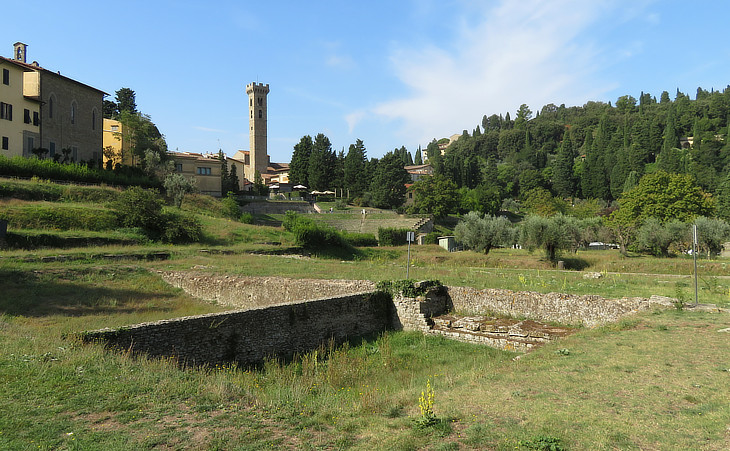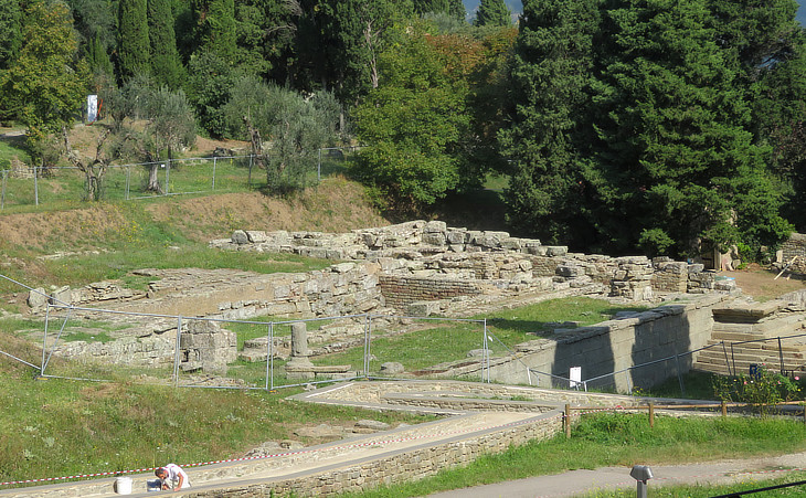 Since the Fiesole hillside is made up of sloping terraces, the forum of Faesulae was probably in the modern Piazza Mino da Fiesole, a famous Renaissance sculptor, (upper right corner) which is the centre of the modern town and which enjoys an open view towards Florence. The theatre was built on several levels and it stood between the forum and the temple (No 7) and the baths (No 4).
