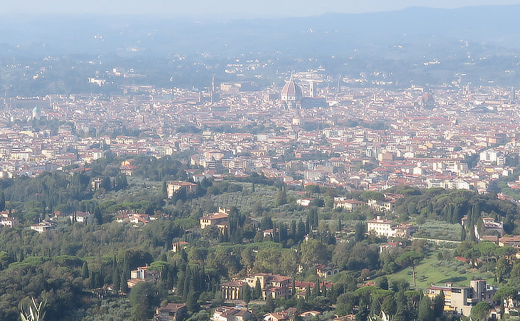 Florence lies in the centre of a gently depressed valley, but the surface in the immediate neighborhood rises and swells in the most picturesque manner, and the Apennines, upon the north and west, interpose their brown and wooded crests. From any of the heights around, and especially from the hill of Fiesole, the view is enchanting. The eye encounters no unsightly blots in the landscape, nor is it wearied by any dreary monotony of forms. The earth itself here seems to be endued with something of the soft flexibility of water, so infinitely diversified are the outlines, and such various characters of grandeur, picturesqueness, and beauty, are assumed by the mountain peaks, the gently rounded hills. the long ridges of verdure, and the sloping plains. Florence itself is but the central point of interest in this delightful panorama. (..) Fiesole, the cradle of Florence, occupies the summit of a steep hill, which it takes an hour's brisk walking to reach. (..) In Fiesole, as in most Italian towns, there are churches and a convent, in which are doubtless many things worthy of being seen; but the traveller, unless he can spend much more time than I had at my disposal, will hardly linger under any roof, while so enchanting a prospect tempts him without. Language breaks down in the effort to fix upon paper the impressions awakened by a landscape of such beauty, such variety, and such extent.