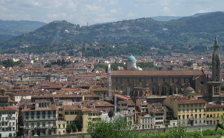 View of the hill of Fiesole, marked by the tall bell tower of its cathedral, and of S. Croce, one of the largest churches of Florence, seen from near Forte del Belvedere