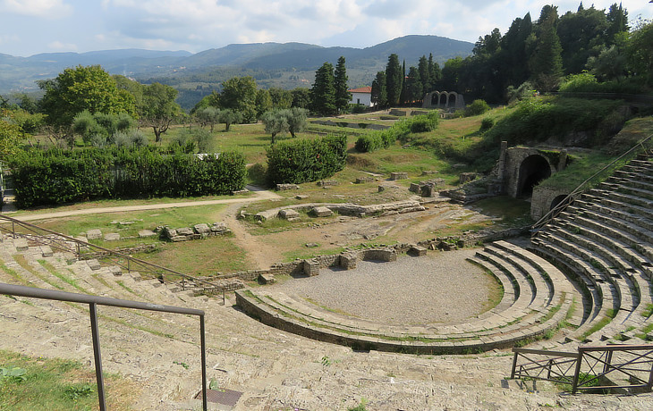 Fiesole was at its height under Emperor Augustus. To this time belong the theatre, the baths, and perhaps the rebuilding of an Etruscan temple, destroyed by fire at the beginning of the Ist century BC and reconstructed with its annexes at a higher level with a slightly amplified plan. The central part of the cavea (seating section) of the theatre rests against the hill while the lateral sections are supported by vaulted structures. The theatre must have been refurbished during the IInd century AD. The theatre was excavated again in 1873-1874 and its reconstruction was criticized for being excessive. The audience enjoyed a fine view over Valle del Mugnone, the valley to the north of Fiesole.