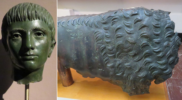 Museo Archeologico Nazionale di Firenze: bronze head of an Etruscan youth, perhaps from Fiesole (IVth century BC); (right) Museo Archeologico di Fiesole: bronze torso of a lion or a she-wolf (IInd century BC)