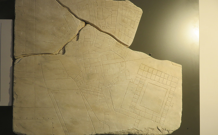 Vespasian reorganized the city from the material as well as from an administrative point of view; (..) a new map of the city was drawn, and the cadastre of public and private property revised. These documents were deposited in a fireproof building, an oblong hall 42 metres long, 25 metres wide, constructed expressly on the west side of the Forum Pacis, between it and the Sacra Via. (..) The map of the city, drawn in accordance with the last official survey and the results of the census, was exhibited on the side of the hall facing the Forum of Peace. We do not know whether it was simply drawn in colors on plaster, (..) or engraved on marble. (..) The city was again half destroyed by fire in the year 191, under Commodus. (..) The house of the Vestals, the jewelers' shops on the Sacra Via, (..) and the Forum and Temple of Peace were leveled to the ground. (..) Septimius Severus and his son Caracalla undertook, with the reconstruction of the city, the reestablishment of the archives of the cadastre, and, in memory of their work (..), they caused a new and revised edition of the plan of the city to be engraved in marble and exhibited in the same place, that is to say, on the front of the building facing the Forum of Peace. (..) This celebrated "Forma Urbis" was engraved on marble at an approximate scale of 1:250.