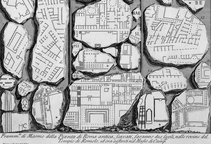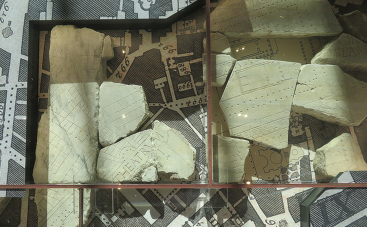 all the fragments in one place!I remember I saw Workmen digging behind the Church of Sts Cosmas and Damianus and that they took up a Marble Table Stone; which stuck to the Wall in the nature of casing, and on it was carv'd both the Plan and the Prospect of the City of Rome. (..) The Marble is now in the Collection of Cardinal (Alessandro) Farnese. Flaminius Vacca's 1594 account of discoveries of antiquities which took place in his lifetime, as quoted in "The Travels of the Learned Father Montfaucon from Paris thro' Italy - 1712"