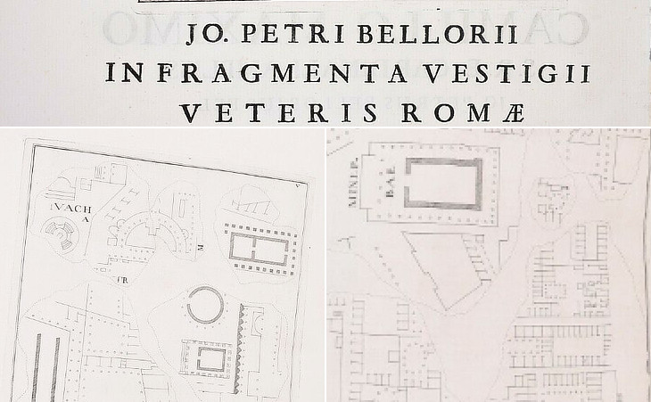 (above) Title of Giovanni Pietro Bellori's 1673 book showing the fragments of "Forma Urbis" (aka Farnesian Tables) at Palazzo Farnese; (below-left) a fragment showing (VACH-A), perhaps a small temple to Minerva Chalcidica; (below-right) a fragment showing a temple to Minerva on the Aventine; we know that it was peripteral hexastyle, about 22 metres wide and 45 long, with 13 columns on each side, only because of the fragment, because the building itself is yet to be found