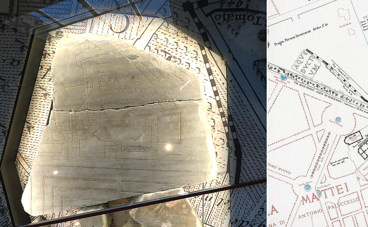 (left) Fragment showing the aqueduct on the Coelian hill; (right) the same fragment shown by Rodolfo Lanciani in "Forma Urbis Romae" (1893-1901)