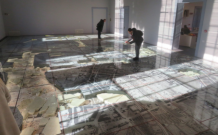 Museo della "Forma Urbis" (inaugurated in January 2024 together with nearby Parco Archeologico del Celio): main hall where fragments of the marble map are inserted in a glass floor upon which is printed for reference the Map of Rome drawn by Giovan Battista Nolli in 1748