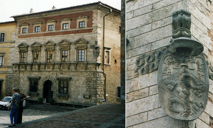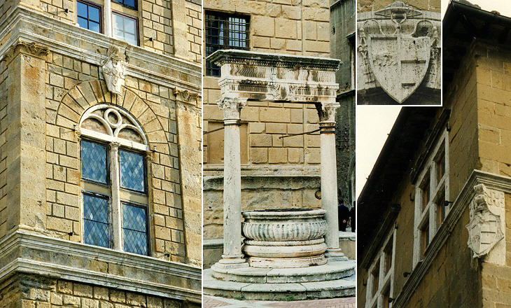 On the main square two palaces flank the church. The Piccolomini Palace is built in typical Florentine style, while the palace built by Cardinal Rodrigo Borgia (who eventually became Pope Alexander VI) has a more sober design and windows similar to those of Palazzo Venezia in Rome.