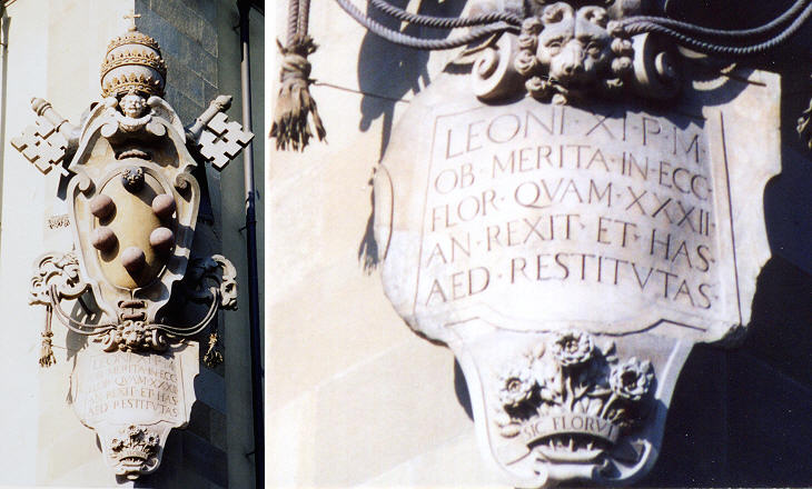 Pope Leo XI, Alessandro de' Medici was before his election Archbishop of Florence for 32 years and he rebuilt the Archbishop's Palace in Piazza del Duomo. A gigantic coat of arms celebrates this fact. The three roses with the motto "Sic Florui" (I blossomed in this way) are a reference to the fact the Leo XI was pope for only a few days. Elected on April 1, 1605, he died on April 27. A similar symbol is on his tomb in S. Pietro.