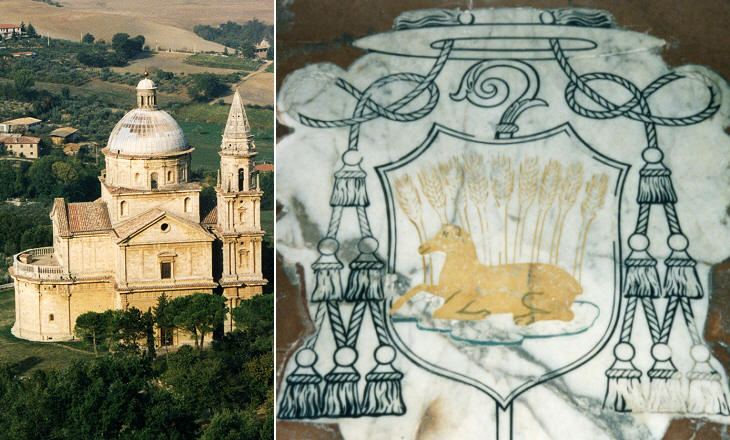 The Cervini family was very influential in Montepulciano and a fine coat of arms of a Cardinal Cervini can be found in Madonna di S. Biagio. Let's spend a couple of words on this Renaissance church, which has a Greek cross shape. At one point it was considered as a model for the completion of S. Pietro itself and you may try to figure out how the basilica would have been if this project had been implemented.
