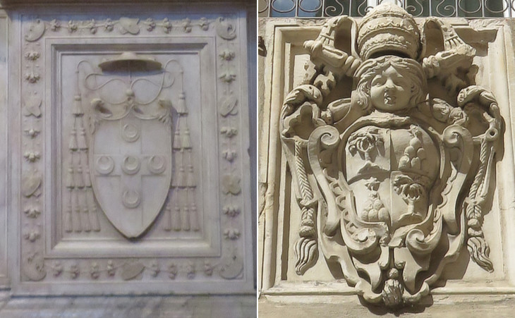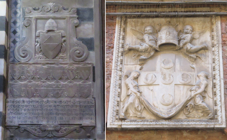 Papal coats of arms: (left) Pius III as a cardinal (in the Cathedral by Andrea Bregno); (right) Alexander VII (at Palazzo Landi, Piazza S. Giovanni)