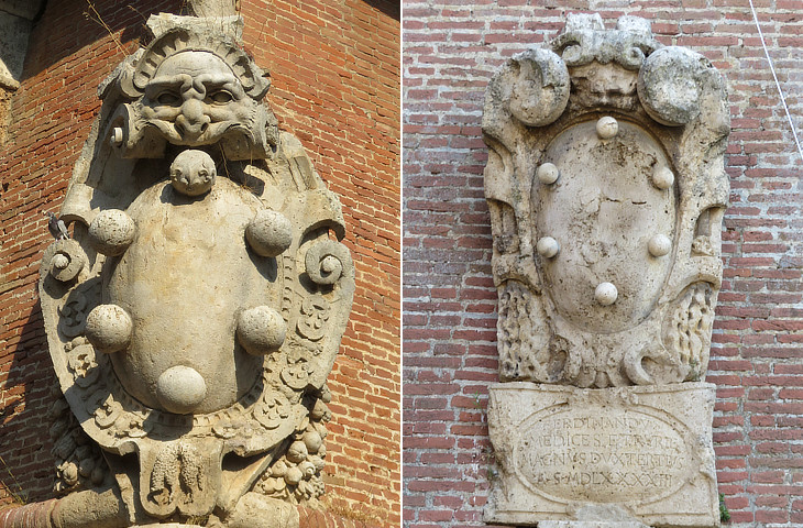 (left) Bastione Maiano: coat of arms of Francesco I, surrounded by the collar of the Golden Fleece; (right) La Rocca Medicea: 1593 coat of arms of Ferdinand I