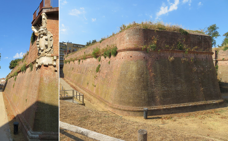 (left) Bastione Maiano (the name of a local stream) or delle Palle, the popular name of the Medici's heraldic symbol; (right) its "orecchione" ("large ear" bastion)