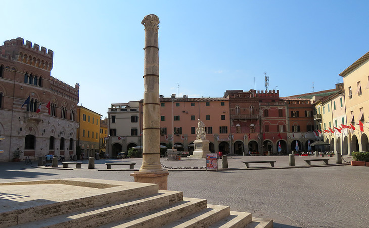 Piazza Dante, the main square of historical Grosseto, but its apparently medieval aspect is the result of a XIXth redesign; the Roman column from Rusellae was erected in 1966