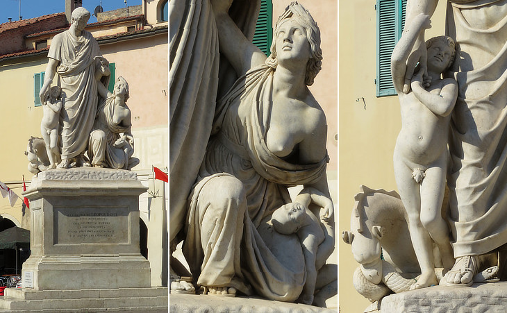 (left) 1846 Monument to Grand Duke Leopold II of Tuscany in ancient Roman attire by Luigi Magi; (centre) personification of Maremma with a fever-stricken child; (right) a healthy child at the side of the Grand Duke who crushes the snake of malaria which is also attacked by a griffin, the heraldic symbol of Grosseto