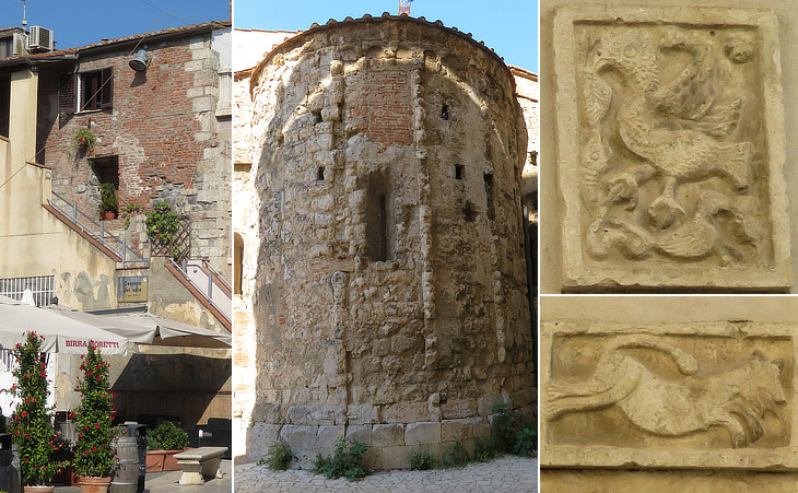 (left) Cassero (Keep) del Sale (XIVth century); (centre) S. Pietro: apse (XIIth century); (right) S. Pietro: early medieval reliefs on the façade