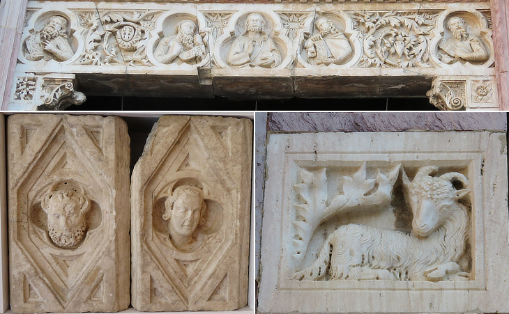 Cathedral: (above) lintel of the side portal: Jesus and the Evangelists; (below-left) details of the side portal (at Museo Diocesano); (below-right) relief from the façade