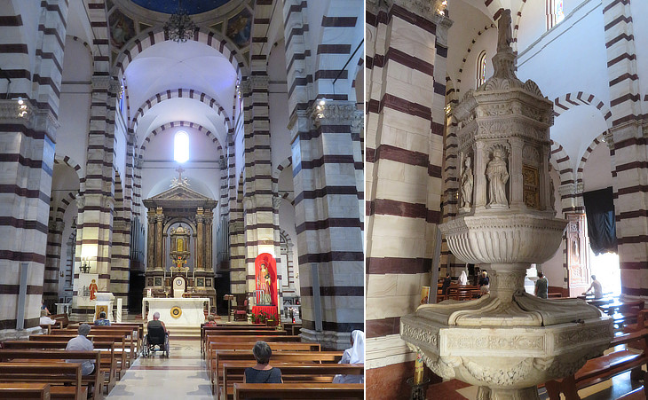 Cathedral: (left) interior; (right) baptismal font