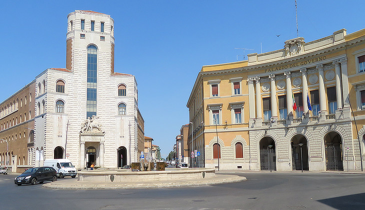 Modern Grosseto: Palazzo delle Poste (1932) by Angelo Mazzoni (left) and Palazzo del Governo (1927) by Vittorio Mariani (right)