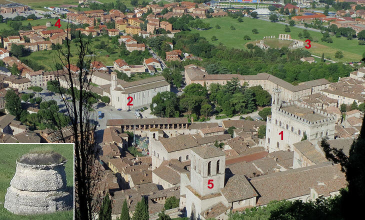 View of Gubbio from the road to S. Ubaldo: 1) Palazzo dei Consoli; 2) S. Francesco; 3) Roman Theatre; 4) Roman mausoleum; 5) Cathedral; (inset) Roman mausoleum