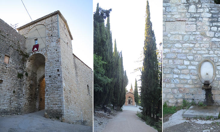 En route to S. Ubaldo: (left) Porta S. Ubaldo; (centre) a chapel along the route; (right) Fonte di S. Ubaldo