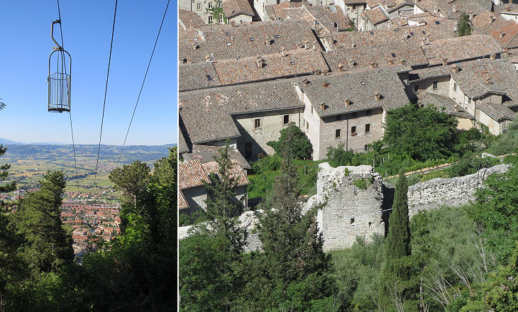 (left) A cage of the aerial lift; (right) view of the walls of Gubbio on the mountain side from the cable car