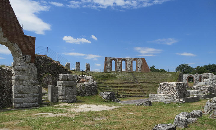 (left) Roman Theatre; (right) detail of a mosaic found at a villa in the countryside