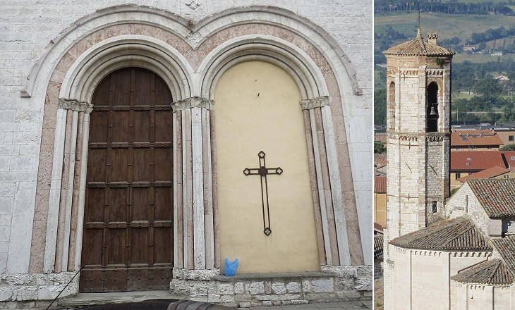 S. Francesco: (left) twin portals (old entrance) decorated with a pink stone which was quarried on Mount Subasio; (right) XVIth century bell tower seen from Piazza Grande