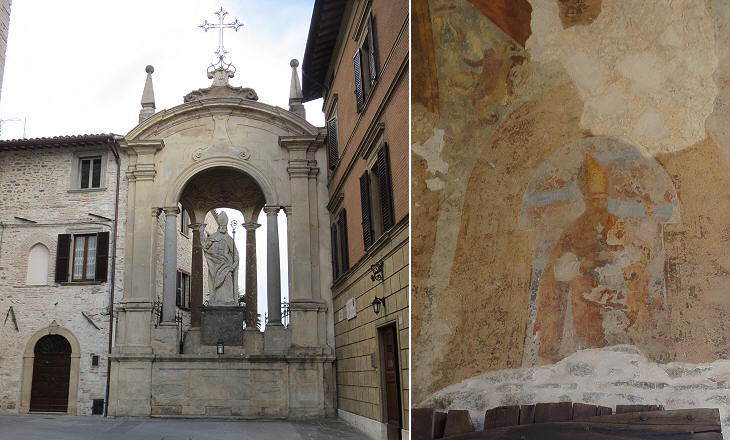 (left) XVIIIth century monument to St. Ubald; (right) St. Ubald in a fresco at Porta Metauro