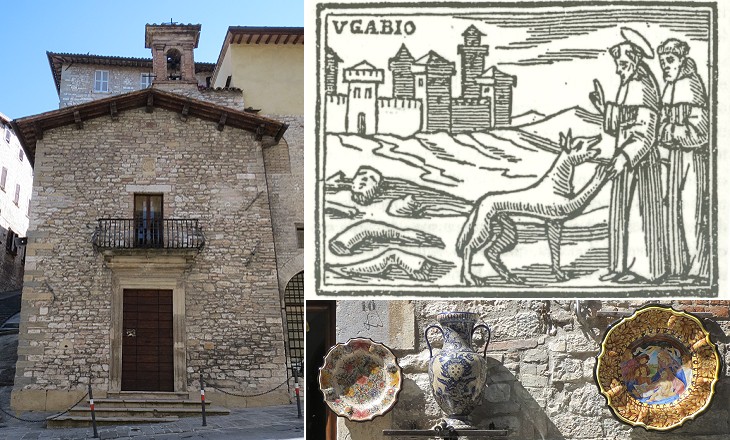 (left) S. Francesco alla Pace; (right-above) engraving showing St. Francis of Assisi and the Wolf of Gubbio; (right-below) modern glazed pottery