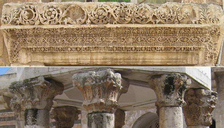 Umayyad mosque: (above) ancient lintel; (below) ancient capitals