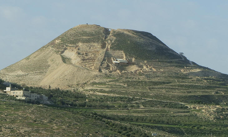 The hill chosen by Herod the Great, King of Judea in 37-4 BC, to build his palace/fortress is a landmark for its unmistakable conic shape, similar to a volcano, which to some extent is man-made. It stands eight miles south of Jerusalem in the West Bank.