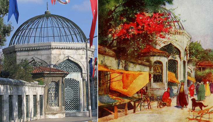 (left) Yeni Valide Turbesi; (right) "Tomb in Scutari" by Warwick Goble, a 1906 illustration of "Constantinople", a Black's Beautiful Book (see other works by Goble portraying people and street scenes)