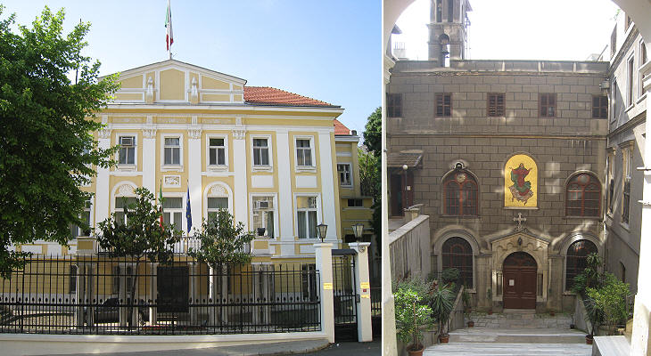 Catholic (Latin according to usage in the Levant) churches were not allowed within the walls of Ottoman Constantinople: the Franciscans had to relocate a parish they had in the city, first to Galata and later on near the Venetian embassy; the church was built in 1769, but its current aspect is due a later reconstruction. Draperis is the surname of an Italian lady who made a donation.