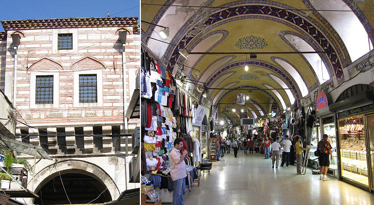 Kapali Carsi: (left) detail of a building above the market; (right) one of the main covered streets