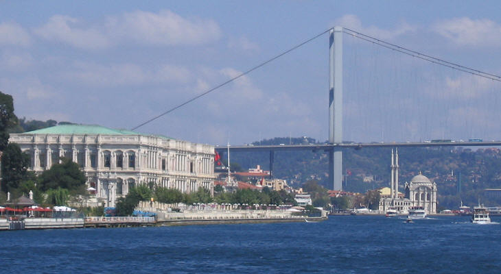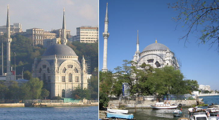 1874 Ciragan Sarayi (left) and 1854 Ortakoy Camii (right) and the 1973 Bosporus First Bridge