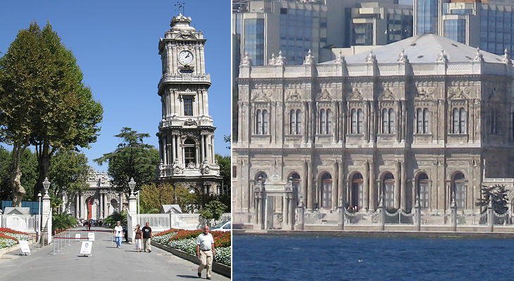 Dolmabahce Sarayi: (left) entrance and clock tower; (right) central building