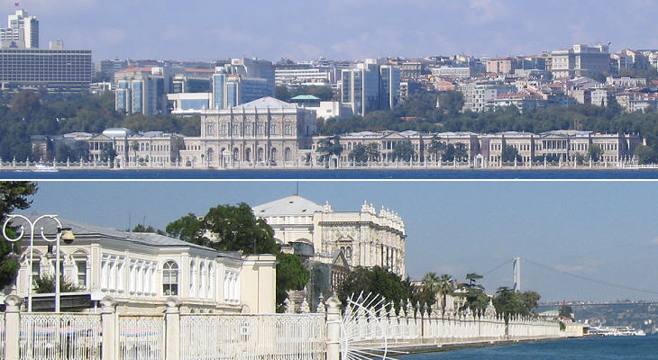 Dolmabahce Sarayi (1854): (above) seen from the Bosporus; (below) view from the south