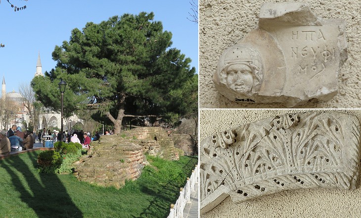 (left) Walls of the Palace of Antiochos which included the Church of St. Euphemia (near the Hippodrome); (right) Archaeological Museum of Istanbul: fragments of reliefs which decorated the church