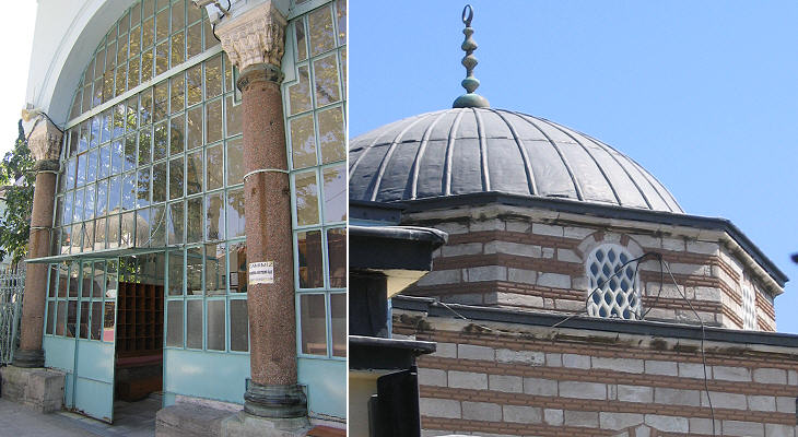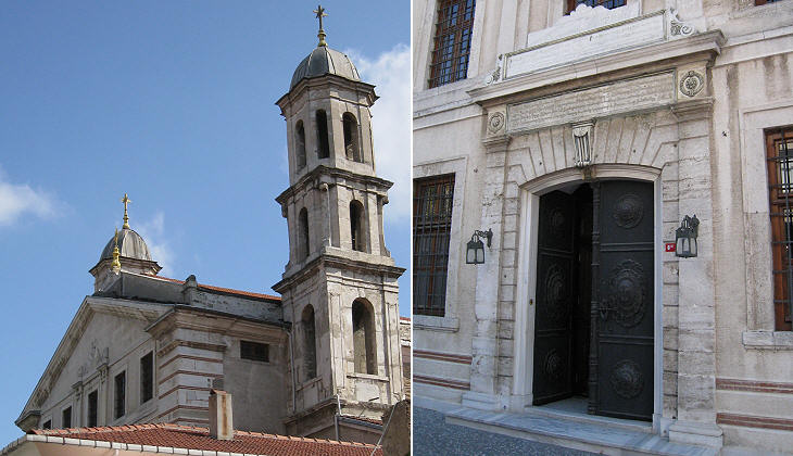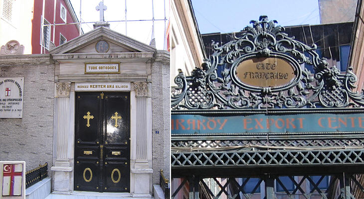 (left) Turkish Orthodox Church; (right) entrance to a section of the passenger terminal at Karakoy (Galata) which was built in 1895 by a French company